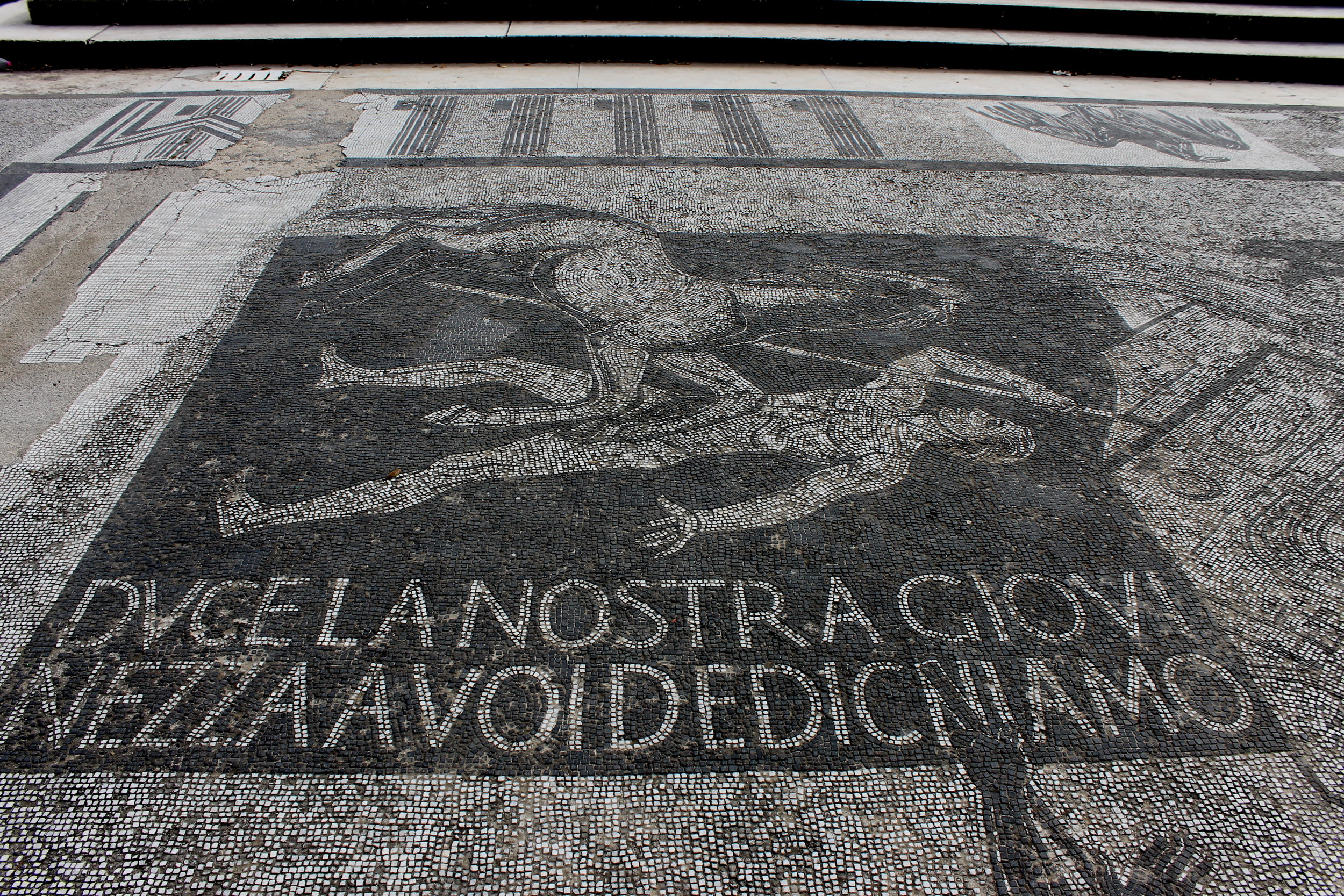 One day I also paid a visit to the infamous Foro Italico, which is filled with an array of visual instantiations of romanità, not least its monochromatic mosaics which recall those found at Ostia and many other archaeological sites (such as the Villa Adriana where I’ve excavated in the past). One mosaic, on the way to the stadium, announces to Mussolini, “Duce, we dedicate our youth to you!”, featuring a youth with a horse, and nearby two athletic youths seemingly engaged in shot-put and the pole vault.
